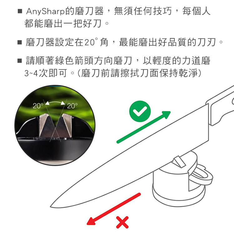 兩個刀片組成完美的20度角,最能磨出好品質的刀刃。