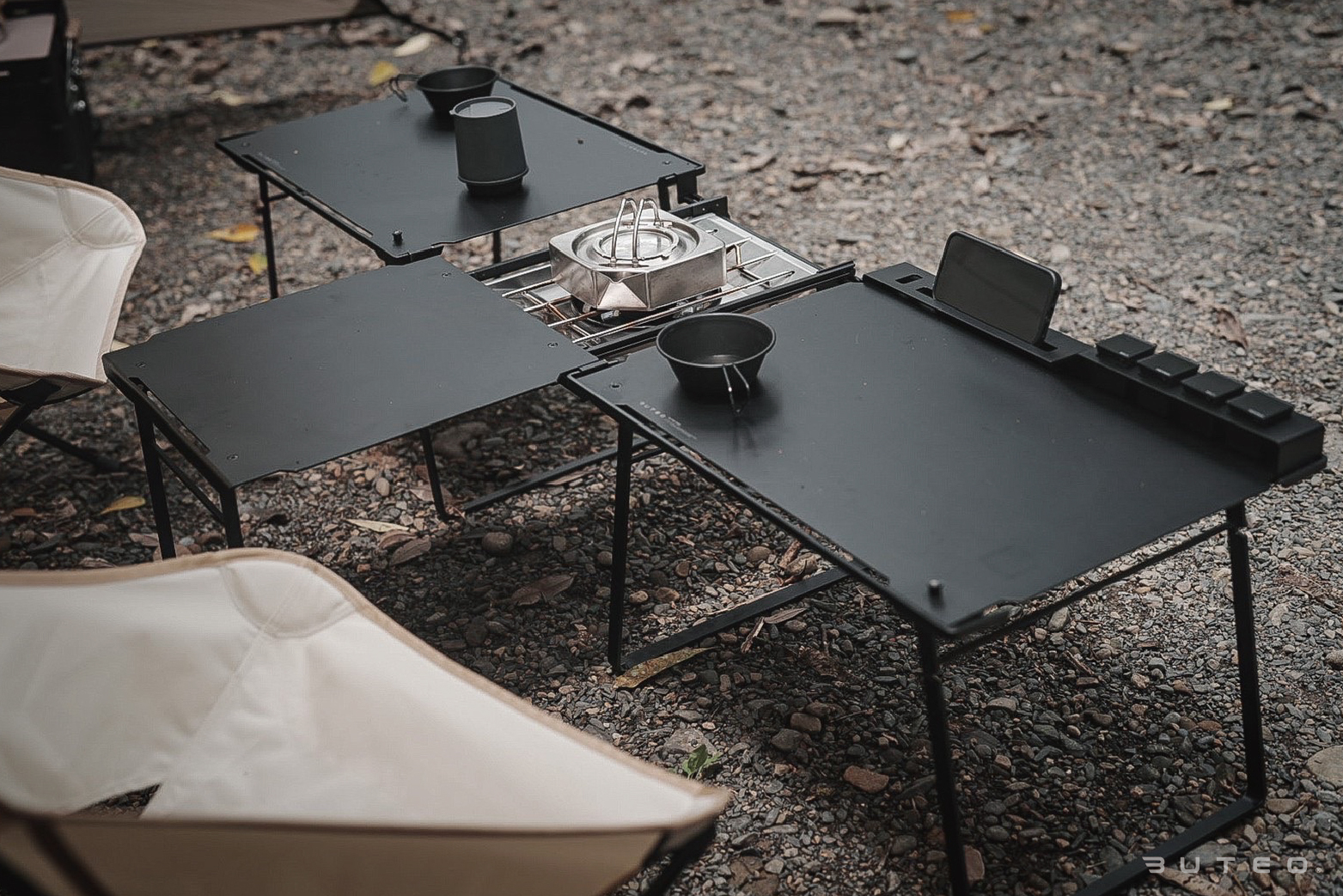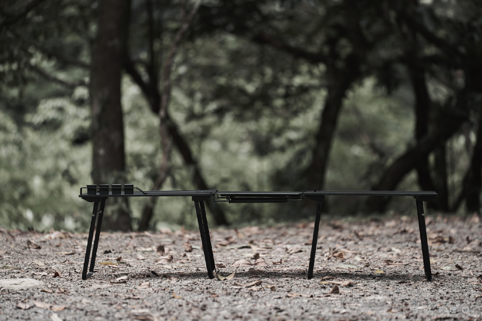 BUTEO 堡壘系列架橋桌,目的在串接兩張堡壘主桌延長桌面且保持整體感,請注意架橋桌無法單張獨自站立與使用。連結好兩張堡壘主桌後的架橋桌本身可以向外拉開站立,留下的空間可置入一單位尺寸之爐具(請以實際預留空間考慮爐具大小),讓桌面整體呈現T字型,適合多人聚會使用。材質採用鋁合金作為主體,表面以陽極處理展現精緻質感。承重上限 30 公斤。請勿將高溫鍋爐直接置於桌面。