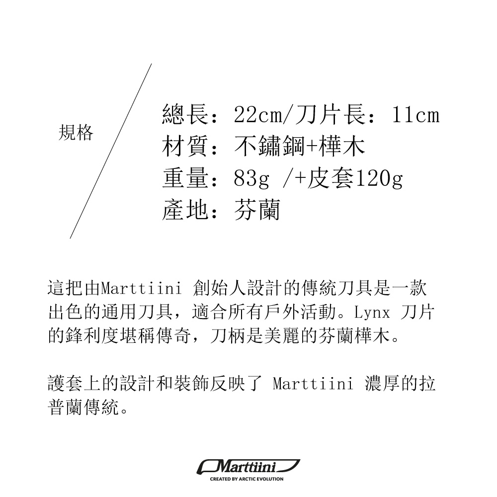 這把由Marttiini 創始人設計的傳統刀具是一款出色的通用刀具,適合所有戶外活動。Lynx 刀片的鋒利度堪稱傳奇,刀柄是美麗的芬蘭樺木。