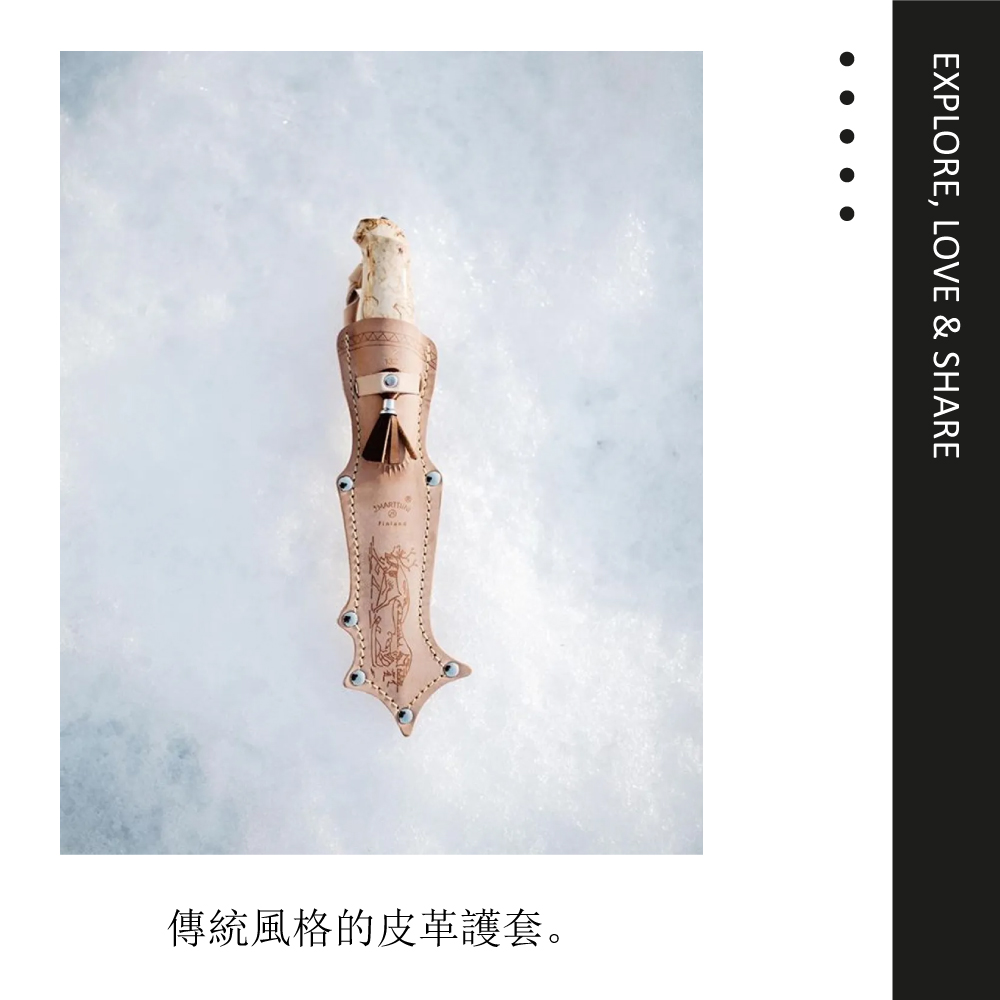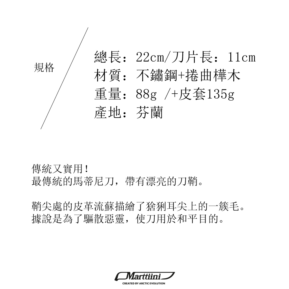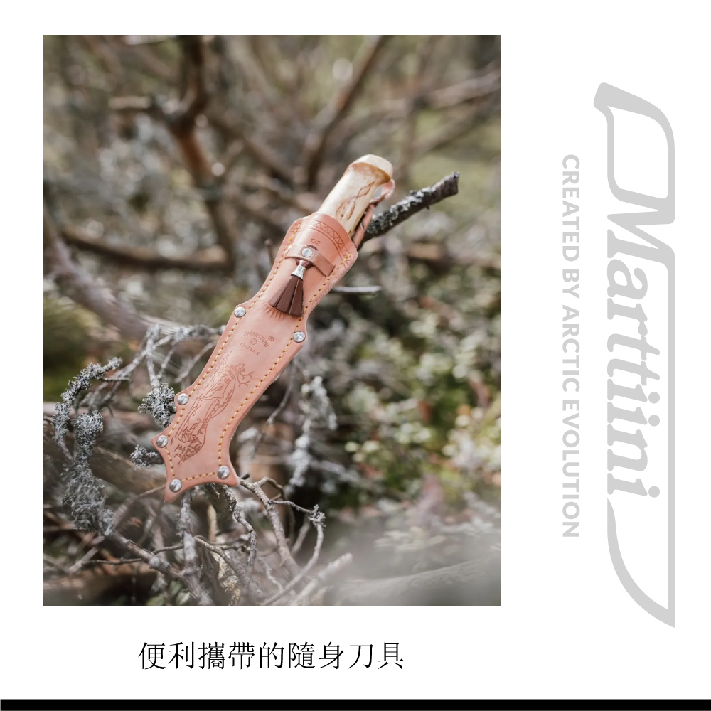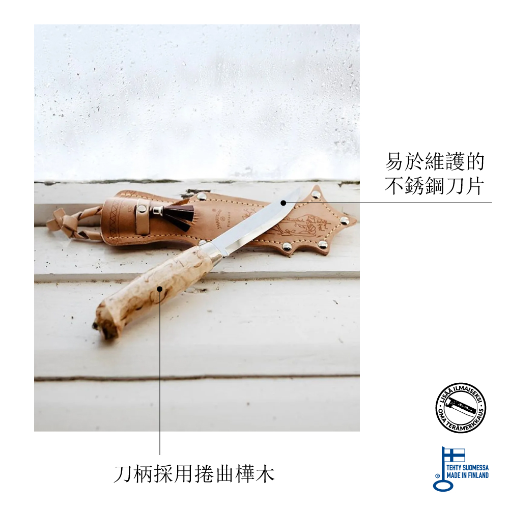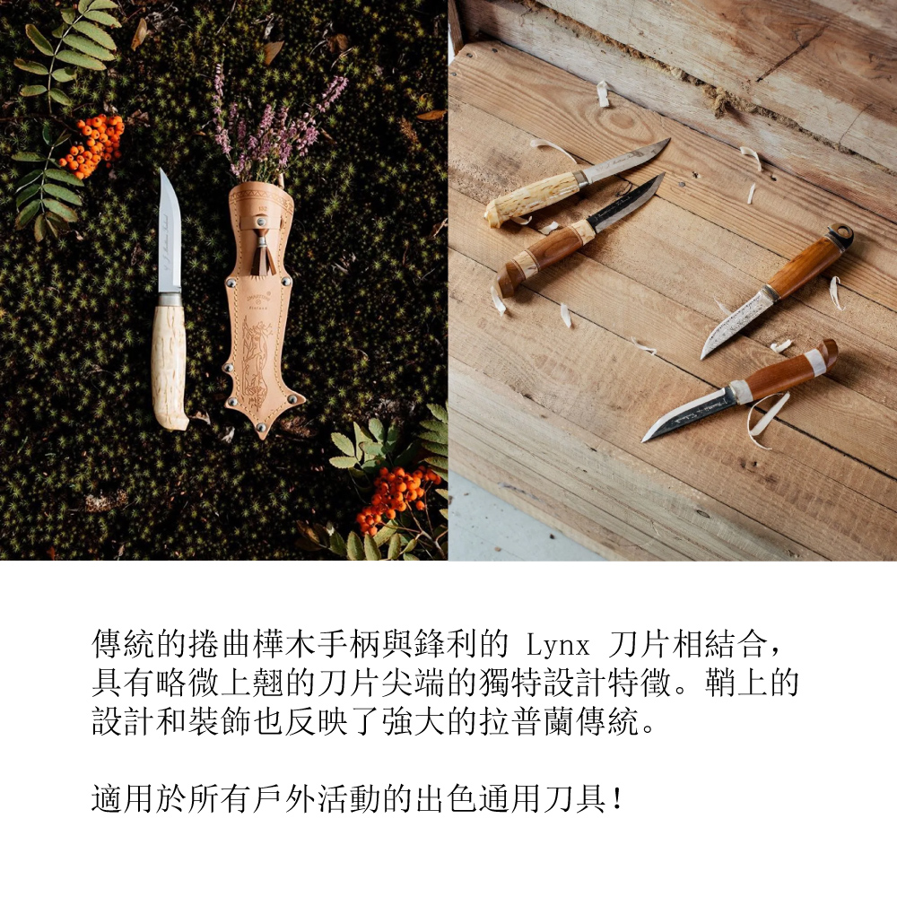 傳統的捲曲樺木手柄與鋒利的 Lynx 刀片相結合,具有略微上翹的刀片尖端的獨特設計特徵。鞘上的設計和裝飾也反映了強大的拉普蘭傳統。