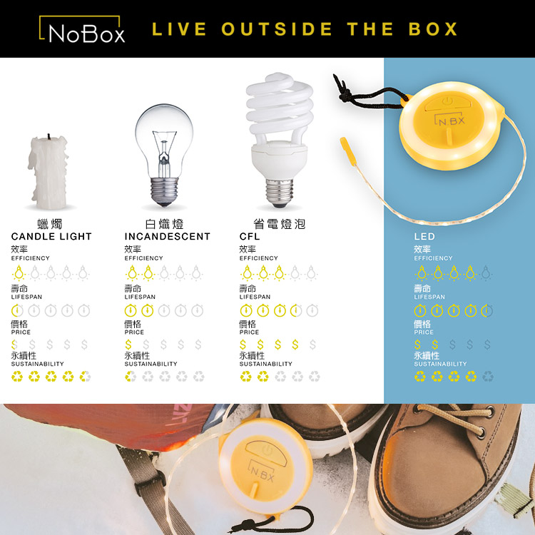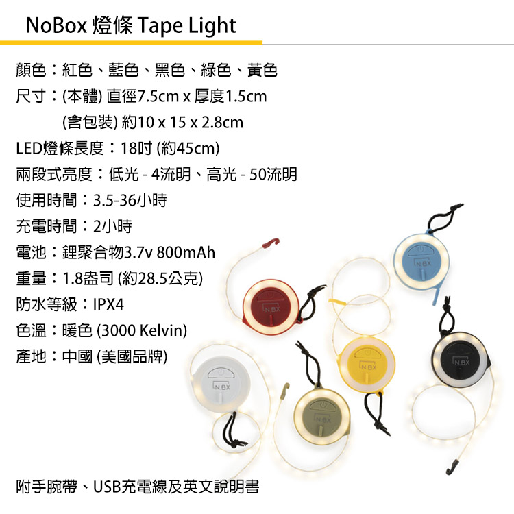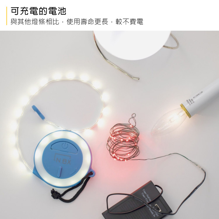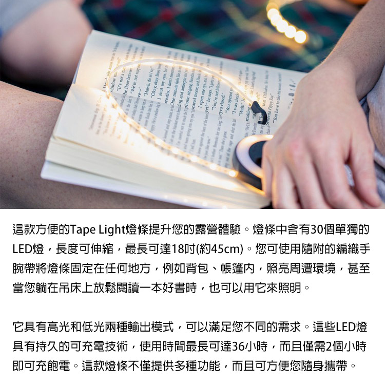 燈條中含有30個單獨的LED燈,長度可伸縮,最長可達18吋(約45cm)。使用時間最長可達36小時,而且僅需2個小時即可充飽電。