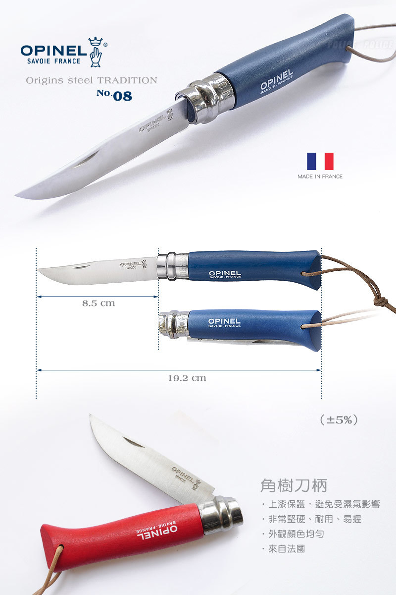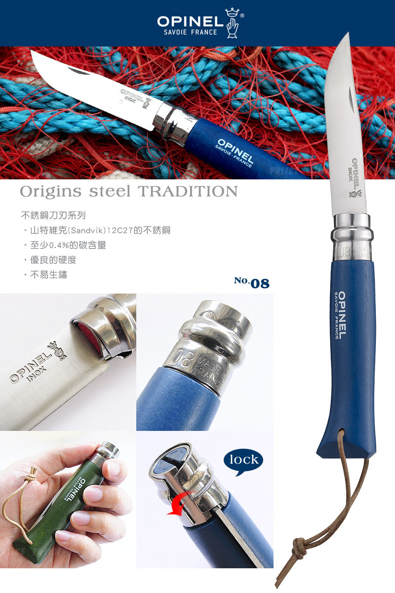 品名:OPINEL Origins steel TRADITION 法國不銹鋼刀原創附皮繩No.08系列