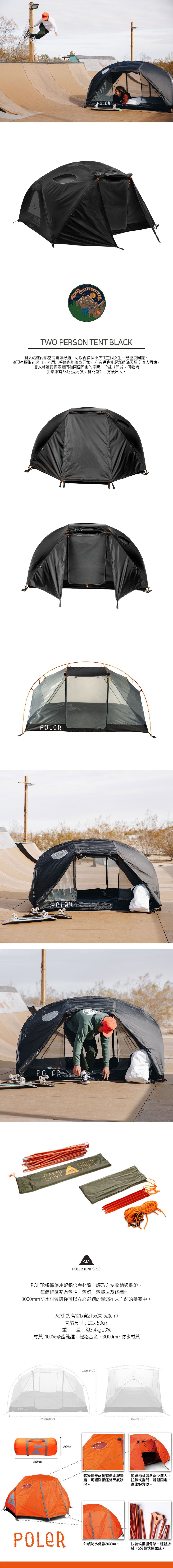 POLER帳篷使用輕鋁合金材質,輕巧方便收納與攜帶, 每個帳篷配有營柱、營釘、營繩以及修補包,3000mm防水材質讓你可以安心舒適的浸溺在大自然的饗宴中。
