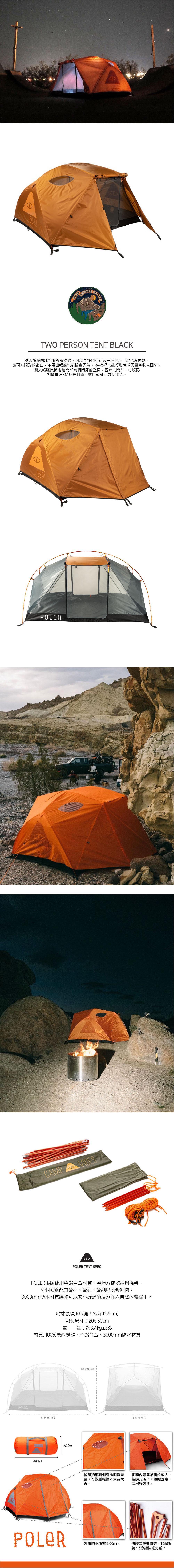 POLER帳篷使用輕鋁合金材質,輕巧方便收納與攜帶, 每個帳篷配有營柱、營釘、營繩以及修補包,3000mm防水材質讓你可以安心舒適的浸溺在大自然的饗宴中。